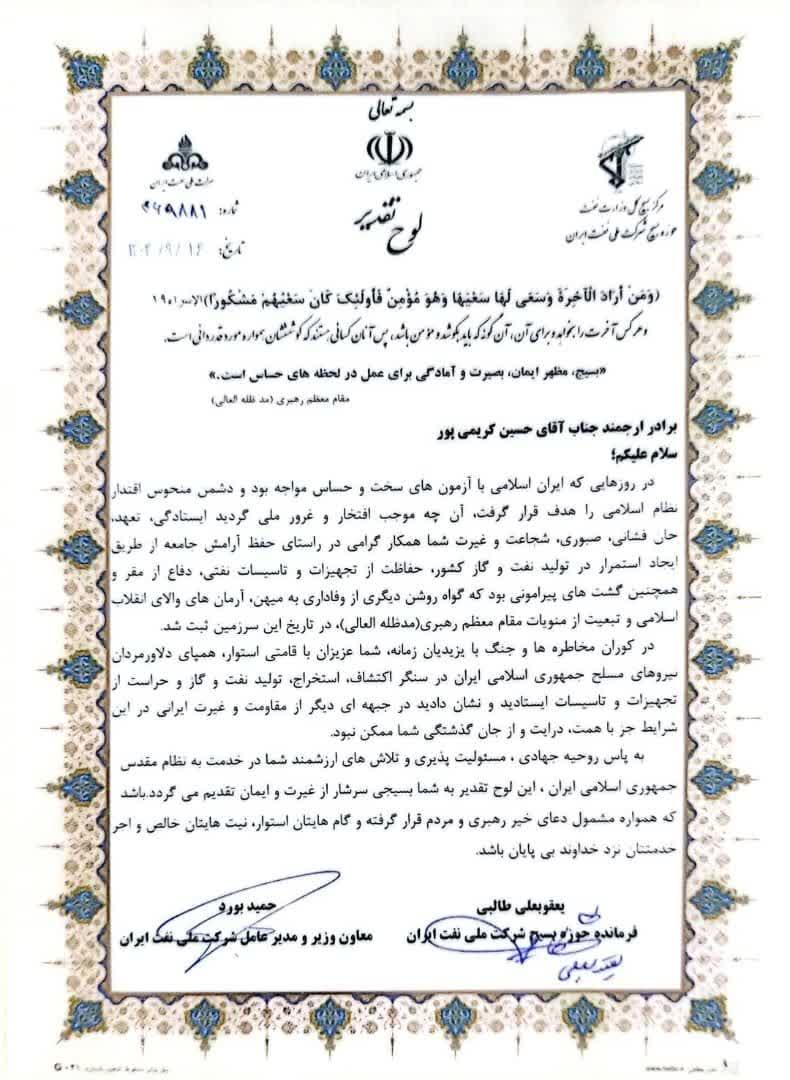وقایع صنعت – در متن لوح تقدیر آمده است: برادر ارجمند جناب آقای حسین کریمی پور سلام علیکم در روزهایی که ایران اسلامی با آزمونهای سخت و حساس مواجه بود و دشمن منحوس اقتدار نظام اسلامی را هدف قرار گرفت، آن چه موجب افتخار و غرور ملی گردید ایستادگی، تعهد، جانفشانی، صبوری، شجاعت و غیرت شما همکار گرامی در راستای حفظ آرامش جامعه از طریق ایجاد استمرار در تولید نفت و گاز کشور، حفاظت از تجهیزات و تأسیسات نفتی، دفاع از مقر و همچنین گشتهای پیرامونی بود که گواه روشن دیگری بر وفاداری به میهن، آرمانهای والای انقلاب اسلامی و تبعیت از منویات مقام معظم رهبری(مدّظلهالعالی) در تاریخ این سرزمین ثبت شد.